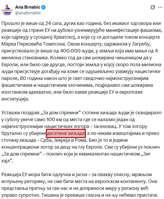 На друштвеној мрежи Х (Твитер) јуче се појавила порука на профилу Ане Брнабић, односно огласила се актуелна предсједница Народне скупштине Републике Србије, поводом Томпсоновог концерта на загребачком хиподрому 5. јула 2025. када је скоро 500.000 Хрвата у трансу пјевало и уживало у екстази невиђених размјера на стихове проблематичне садржине, величајући хрватске злочинце, не само из 1941. већ и 1991. године.