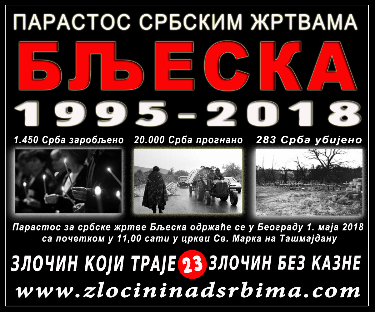 Из удружења "Суза" нам је стигло обавјештење да ће у уторак 1. маја 2018. године у Београду, у Цркви Светог Марка, са почетком у 11 сати, одржаће се парастос жртвама "Бљеска".
