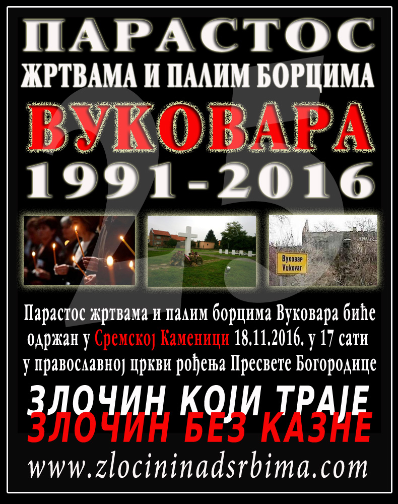 Из Удружења Ћирилица из Београда, стигло нам је саопштење да ће парастос тј. помен за вуковарске жртве које су убијене у другој половини 1991. године у Вуковару и Борову Насељу, бити у петак 18. новембра 2016. у 17:00 сати у православној цркви рођења Пресвете Богородице, у Сремској Каменици, код Новог Сада.