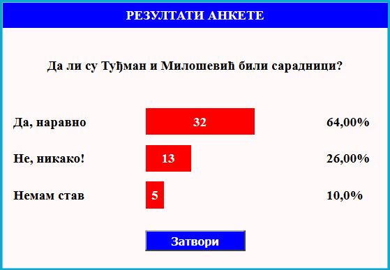 У анкети је учествовало 50 испитаника тј. посетилаца нашег сајта, у периоду од 10-ак дана. Мишљење да Туђман и Милошевић јесу били сарадници дели 64%... скоро две трећине анкетираних. Супротно тој тврдњи тј. да нису били сарадници мисли 26% учесника анкете. Док 10% нема став по овом питању.
