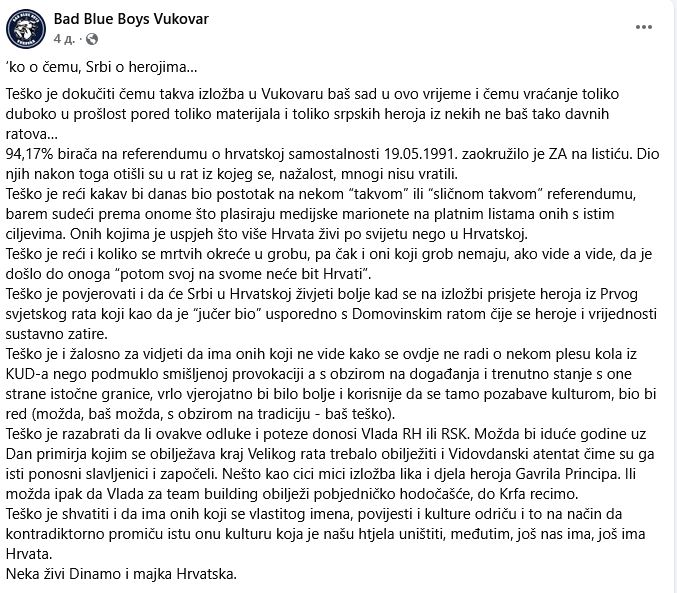 Недавно оглашавање на социјалним мрежама вуковарског клуба "навијача" НК Динамо из Загреба, поводом њихових домољубних активности у самом граду на Вуки, када је изложба "Српкиња" морала бити одложена... заправо забрањена. Овде није реч само о симпатизерима ногометаша "модрих", нити данашњи спорт нема везе са политиком, већ је та њихова акција само један у низу примера хрватских осећања према Србима.