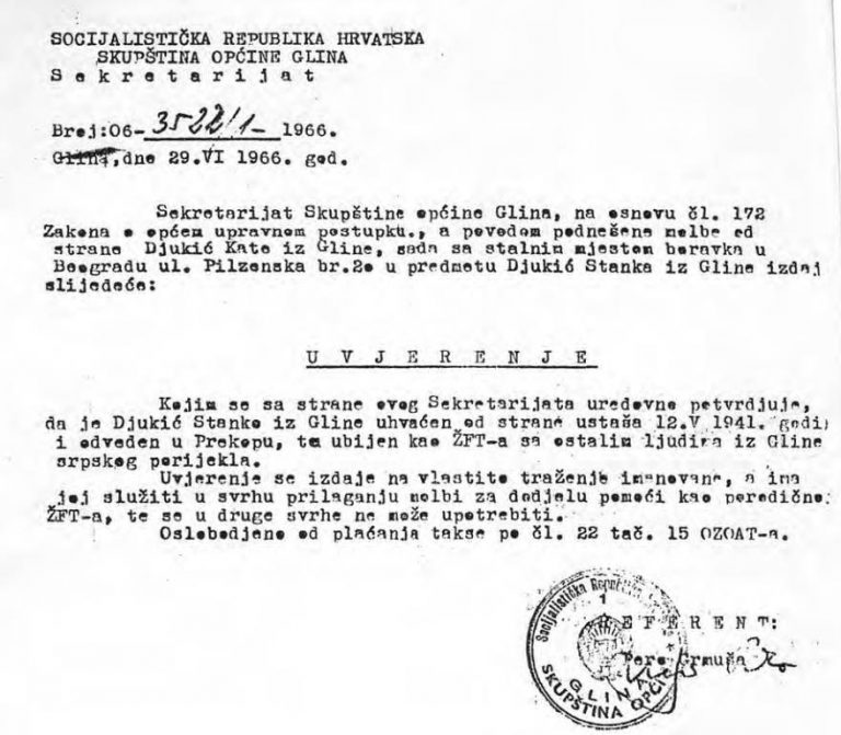 Увjeрeњe Скупштинe опћинe Глинa из 1966.