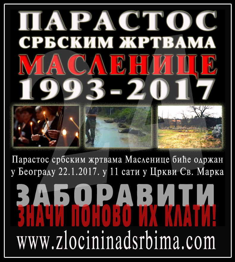 Из Удружења "Суза" из Београда, стигло нам је саопштење да ће парастос за србске жртве које су убијене крајем јануара 1993. године у злочиначкој акцији хрватске војске под шифрованим именом "Масленица 93" у Равним Котарима, бити у недељу 22. јануара 2017. у 11:00 сати у цркви Св. Марка на Ташмајдану.
